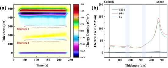 圖2 2.5-2.5復(fù)合材料的a) 空間電荷分布和b) 電場分布