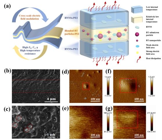 圖1 三明治結(jié)構(gòu)PEI基復(fù)合材料的a) 設(shè)計思路圖,b) 斷面SEM圖和c) 中間層局部放大SEM圖;d-g) BT微納米顆粒在PEI基體內(nèi)的KPFM圖