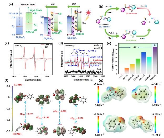 如圖所示,S型異質(zhì)結(jié)的構(gòu)建可以保持高氧化還原電位并改善電荷分離,從而實(shí)現(xiàn)高效光催化反應(yīng)。在Cβ-O鍵的裂解過程中,S型的電荷流動(dòng)方式促進(jìn)了1O2的生成,誘導(dǎo)Cα?自由基的生成。在此過程中Cβ-O鍵的解離能從69.2 kcal/mol大幅衰減到7.8kcal/mol,這一過程促進(jìn)了Cβ-O的劈裂,從而促進(jìn)高值化轉(zhuǎn)化。此外,為了驗(yàn)證CSSB-30光催化劑對(duì)實(shí)際木質(zhì)素中Cβ-O帶的裂解能力,以馬尾松堿木質(zhì)素為底物,堿木質(zhì)素Cβ-O裂解的典型產(chǎn)物為香蘭素,獲得了26.6 mg/木質(zhì)素的香蘭素高產(chǎn)率,證明了堿木質(zhì)素中Cβ-O鍵的有效裂解。