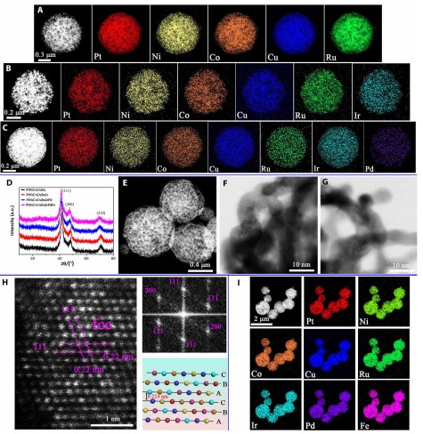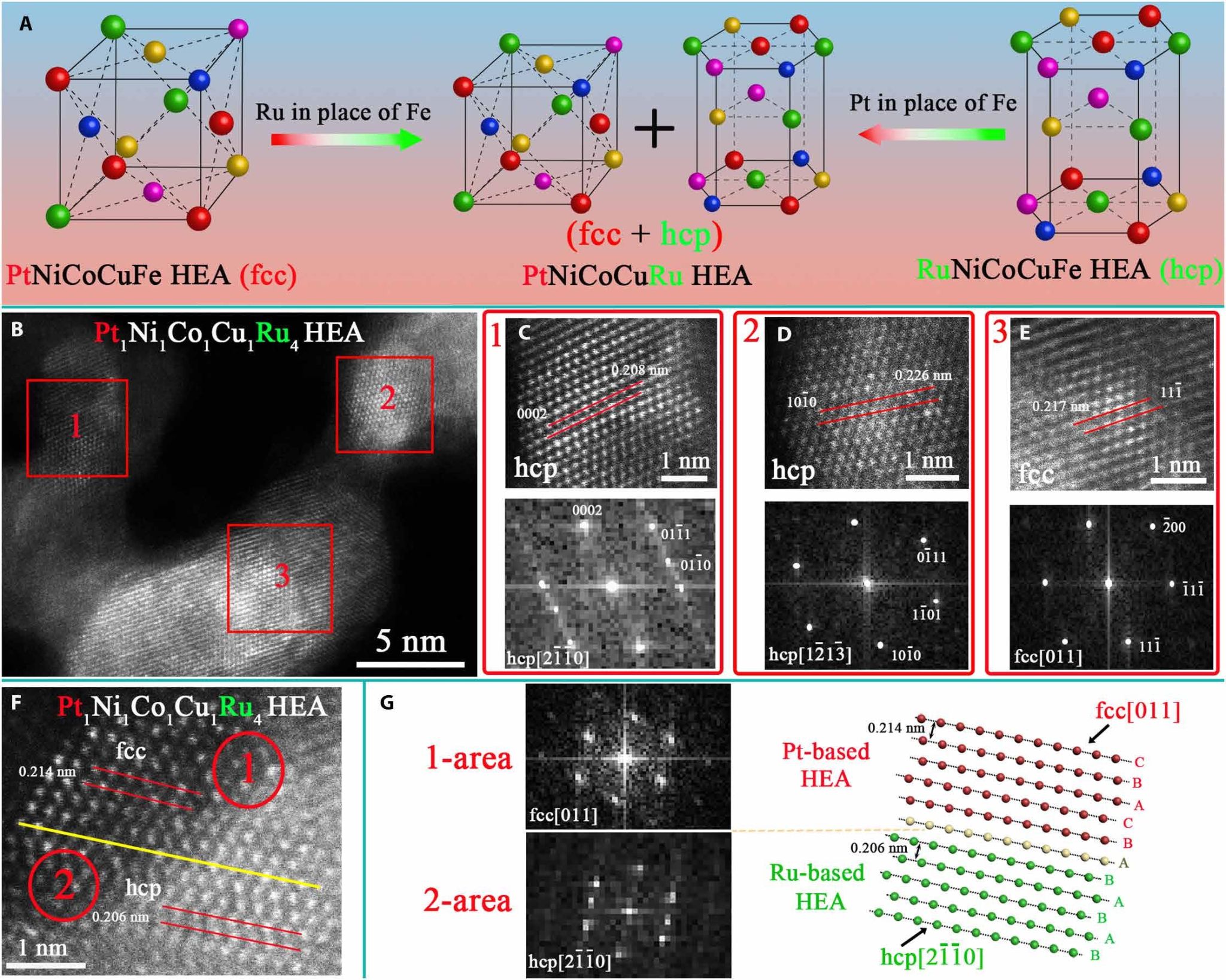 團隊還深入探究了相關(guān)形成機制,發(fā)現(xiàn) Pt、Ru、Ir 等貴金屬元素可降低過渡金屬還原溫度,促進(jìn)單相固溶體形成,為優(yōu)化材料性能提供理論依據(jù)。同時,通過調(diào)整 Pt 與 Ru 比例和還原溫度,借助原位掃描透射電子顯微鏡和密度泛函理論計算,首次實現(xiàn)同一納米顆粒中 fcc 和 hcp 相結(jié)構(gòu)的精確調(diào)控,為定制材料性能創(chuàng)造可能。