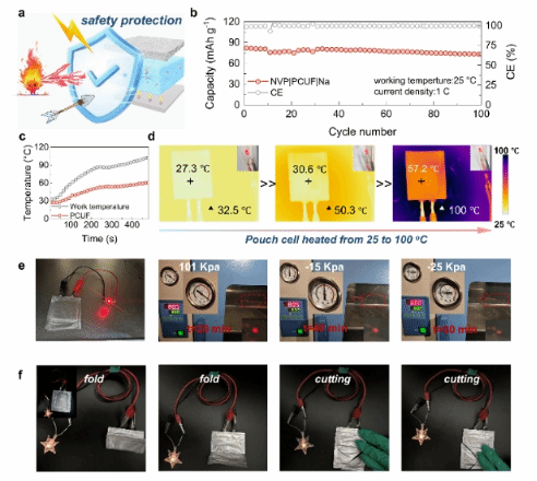 圖4:基于PCUF電解質(zhì)準(zhǔn)固態(tài)鈉金屬軟包電池性能及安全性能測試