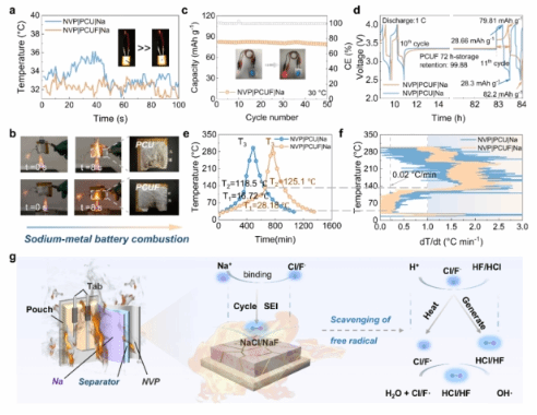 圖5:基于PCUF電解質(zhì)準(zhǔn)固態(tài)鈉金屬軟包電池高溫性能,ARC測試及電池阻燃機(jī)理
