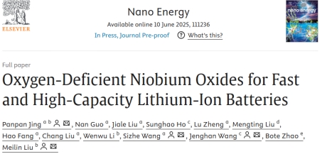 材料學(xué)院景盼盼副教授、王思哲副教授、美國佐治亞理工學(xué)院劉美林教授和臺灣師范大學(xué)王禎翰教授的科研團(tuán)隊聯(lián)合在愛思唯爾(Elsevier)旗下的著名期刊Nano Energy(IF2024=16.8)發(fā)表題為“Oxygen-deficient niobium oxides for fast and high-capacity lithium-ion batteries”的研究型學(xué)術(shù)論文。陜西科技大學(xué)為第一單位,劉美林教授、景盼盼副教授、王思哲副教授和王禎翰教授為共同通訊作者。
