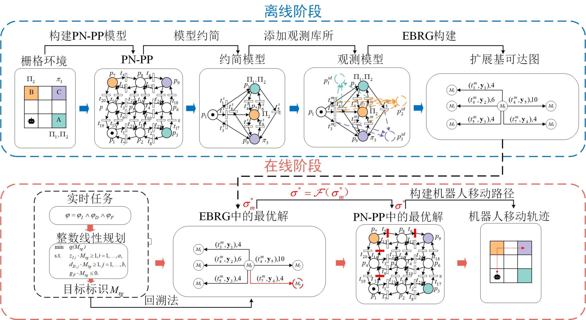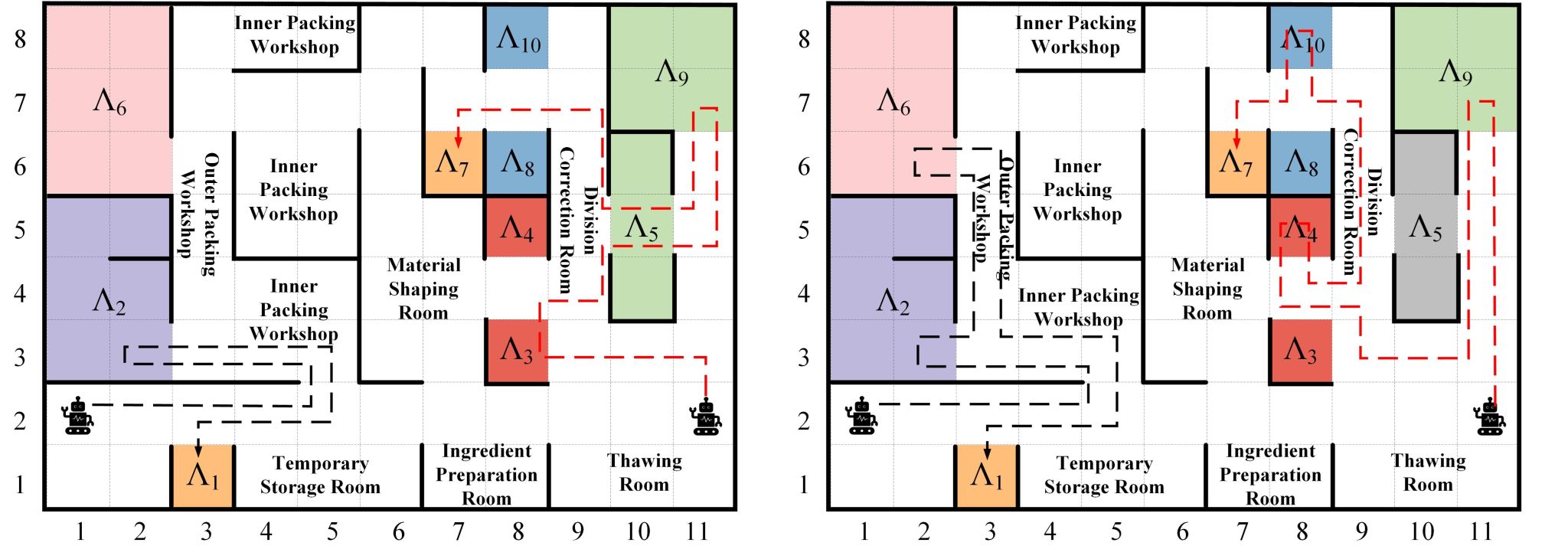 針對上述難點,本研究團隊提出了一種基于Petri網(wǎng)的多機器人系統(tǒng)最優(yōu)路徑規(guī)劃方法。通過將多機器人系統(tǒng)抽象為圖形化的Petri網(wǎng)模型,并設(shè)計結(jié)構(gòu)控制器,實現(xiàn)復雜任務(wù)約束的形式化表征。為避免機器人數(shù)量增加而引發(fā)狀態(tài)爆炸問題,提出一種狀態(tài)空間壓縮方法和高效的實時在線規(guī)劃算法,實現(xiàn)多機器人復雜任務(wù)的實時分配和最優(yōu)路徑規(guī)劃。理論分析與數(shù)值實驗均表明,該方法在保證規(guī)劃最優(yōu)性的同時,顯著提升了計算效率和可擴展性,尤其在機器人數(shù)量和環(huán)境規(guī)模不斷增加的情況下,表現(xiàn)出優(yōu)于現(xiàn)有方法的性能。