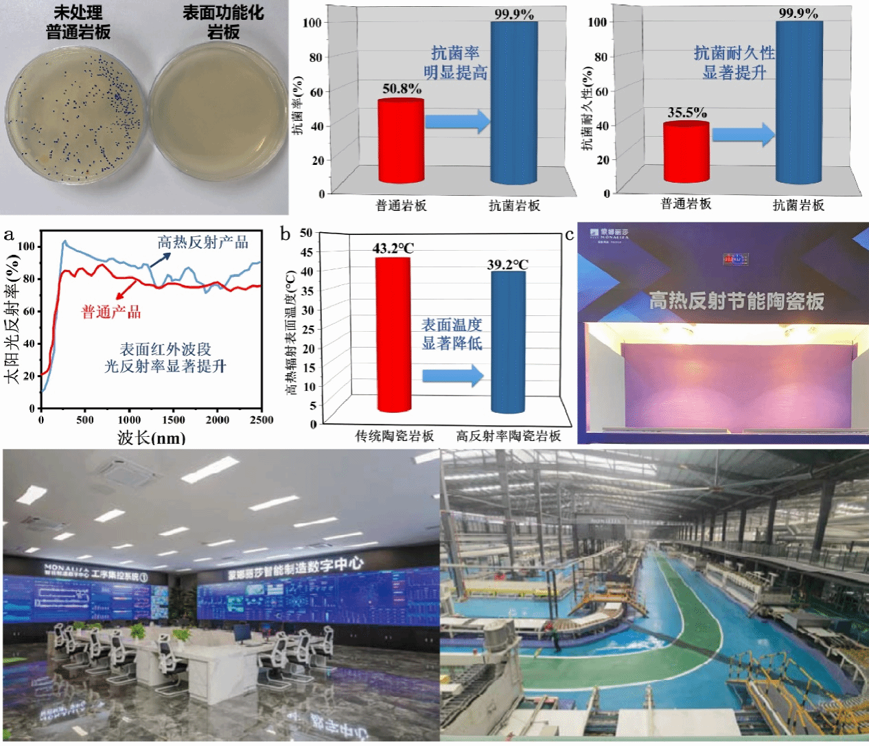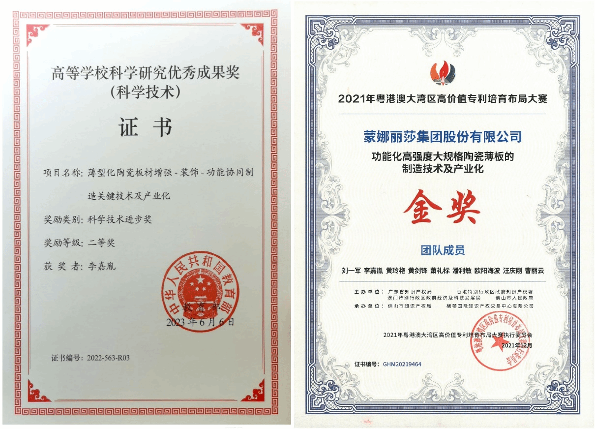 該團隊研發(fā)的高鋁超薄復(fù)合陶瓷巖板彎曲強度達到88Mpa、斷裂功超過290J/m2;通過高通透、低散射微晶熔體及功能性微晶負載技術(shù),巖板可呈現(xiàn)透光率與透光波長可控、兼具遠紅外發(fā)射(發(fā)射率0.917)、抗菌(大腸桿菌抗菌率>99.9%)、高太陽光反射(>90%)等物理化學(xué)性質(zhì),巖板的功能化應(yīng)用價值顯著提升;實現(xiàn)了表面釉的金屬光干粒包裹、高折射閃光??煽胤植己腿嵝阅K雙面拋等多個超薄陶瓷巖板的產(chǎn)業(yè)化自主制造技術(shù),制造的3mm厚度大規(guī)格、高強度、多功能及高通透陶瓷巖板展現(xiàn)出高精準制造成品率(>99%)與優(yōu)品率(>90%),技術(shù)應(yīng)用后累計銷售額20.12億元,新增利潤總額5.05億元,新增稅收總額1.31億元,為建材行業(yè)節(jié)約資源、節(jié)能減排、綠色制造的樹立了典范效果。上述成果獲得教育部科技進步二等獎1項,粵港澳大灣區(qū)高價值專利布局大賽金獎1項。