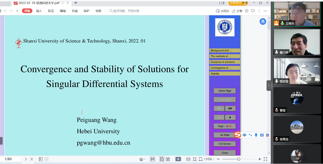 1月18日上午,應(yīng)數(shù)學(xué)與數(shù)據(jù)科學(xué)學(xué)院邀請,河北大學(xué)副校長、教育部大學(xué)數(shù)學(xué)課程教指委委員王培光做客我校“前沿科學(xué)報告”,作了題為“Convergence for Singular Differential Systems with Maxima”的學(xué)術(shù)報告。副校長李學(xué)軍出席報告會,并在報告會之前線上與王培光副校長進(jìn)行了交流。報告由數(shù)學(xué)學(xué)院院長藺小林主持,數(shù)學(xué)學(xué)院領(lǐng)導(dǎo)、全體教師和研究生參加了本次報告。