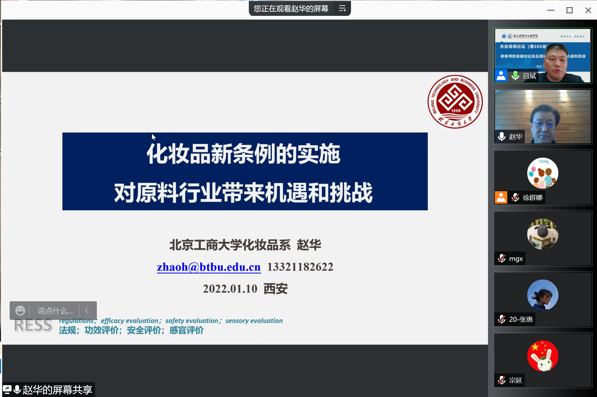 1月10日上午,應(yīng)我校輕工科學(xué)與工程學(xué)院和研究生院邀請(qǐng),北京工商大學(xué)趙華教授做客我?!拔囱雽?dǎo)師論壇”,并作了題為“新條例的實(shí)施對(duì)化妝品原料行業(yè)帶來的機(jī)遇和挑戰(zhàn)”的報(bào)告。報(bào)告由輕工學(xué)院院長(zhǎng)呂斌教授主持,學(xué)院相關(guān)教師和學(xué)生參加了本次報(bào)告會(huì)。受疫情影響,本次報(bào)告采取線上會(huì)議方式進(jìn)行。
