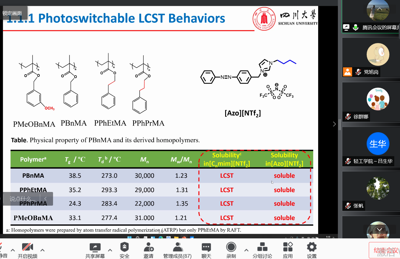 王彩虹副教授首先介紹了離子液體及其在光、熱響應(yīng)智能材料方面應(yīng)用的研究背景,然后結(jié)合聚合物微觀結(jié)構(gòu)響應(yīng)自組裝調(diào)控體系宏觀相變、傳導(dǎo)率變化,重點介紹了刺激響應(yīng)聚合物自組裝調(diào)控離子液體相變及性能。王彩虹副教授的報告邏輯清晰、圖文并茂,引發(fā)了大家對刺激響應(yīng)聚合物新的認識與思考。