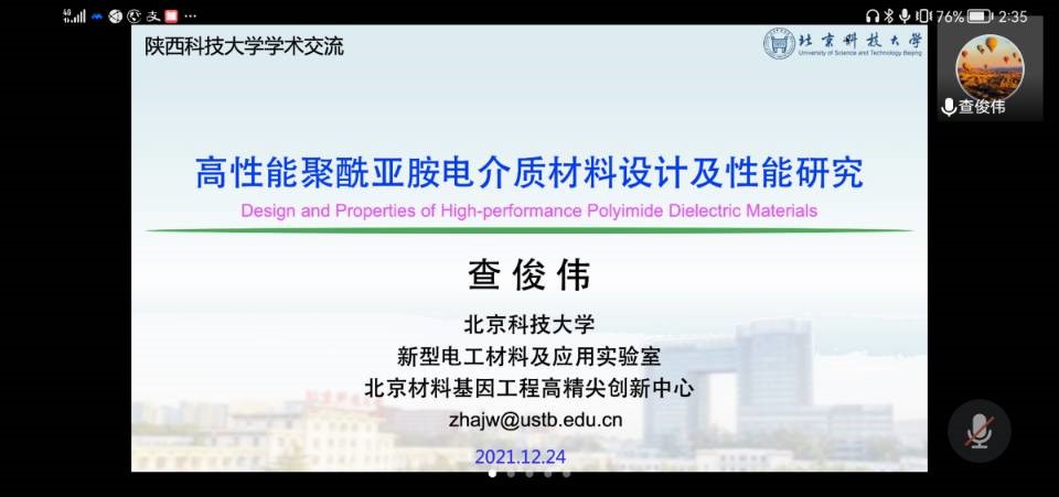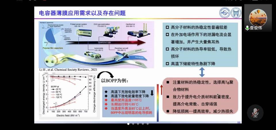 12月24日下午,應(yīng)材料科學(xué)與工程學(xué)院邀請(qǐng),北京交通大學(xué)查俊偉教授做客我?!扒把乜茖W(xué)報(bào)告”論壇,作了題為“高性能聚酰亞胺電介質(zhì)材料設(shè)計(jì)及性能研究”的學(xué)術(shù)報(bào)告。本次報(bào)告由材料學(xué)院王卓副院長(zhǎng)主持,學(xué)院相關(guān)教師和學(xué)生參加了本次報(bào)告會(huì),因疫情影響,本次報(bào)告采取線(xiàn)上的方式進(jìn)行。