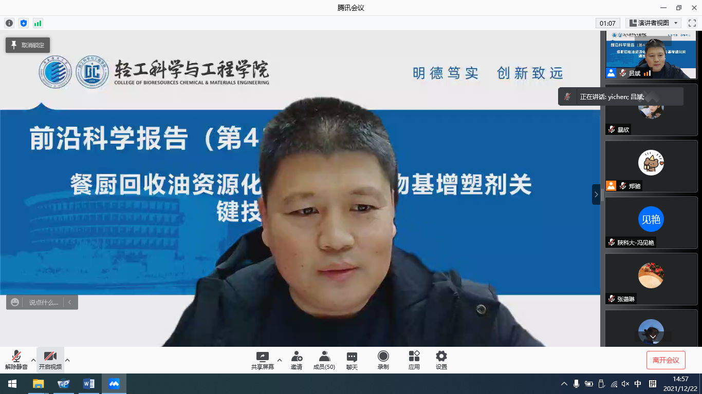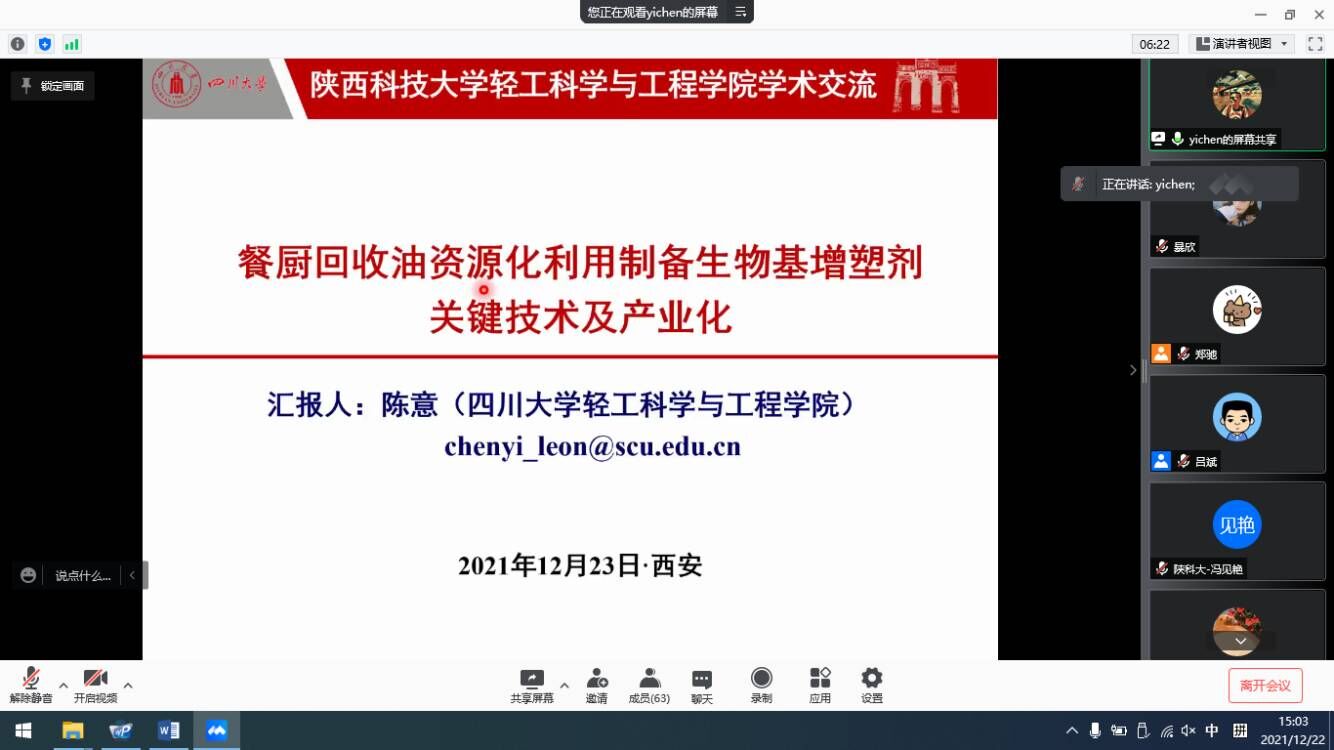 12月22日下午,受輕工科學(xué)與工程學(xué)院、科技處及前沿院邀請,四川大學(xué)陳意教授線上做客我?!扒把乜茖W(xué)報告”,作了題為“餐廚回收油資源化利用制備生物基增塑劑關(guān)鍵技術(shù)及產(chǎn)業(yè)化”的學(xué)術(shù)報告。報告會由輕工學(xué)院院長呂斌主持,學(xué)院相關(guān)專業(yè)教師及研究生參加了本次學(xué)術(shù)報告會。