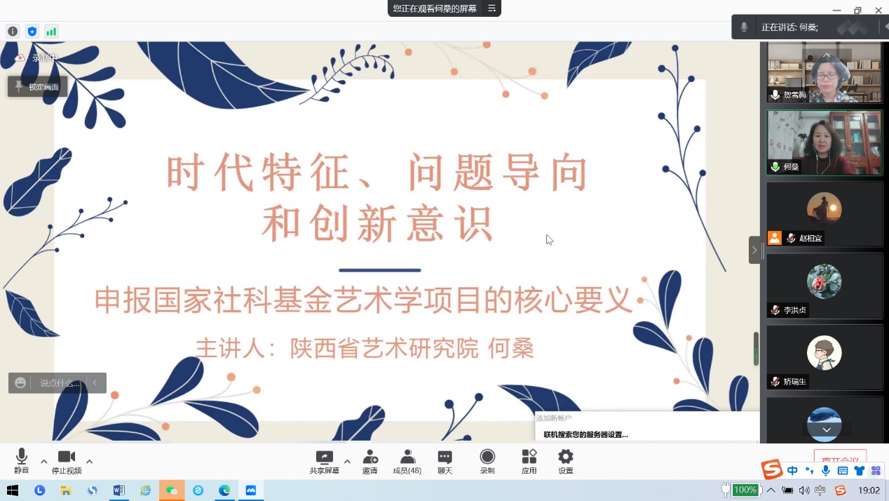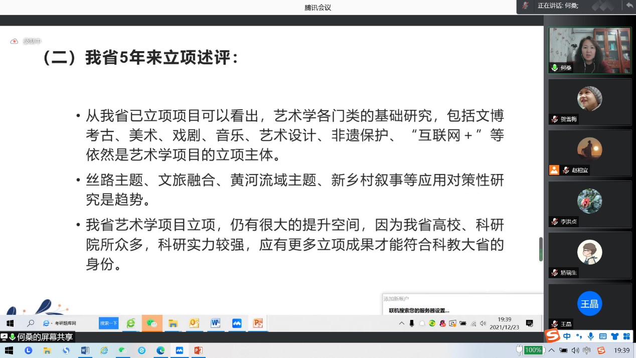 12月23日晚,應(yīng)設(shè)計(jì)與藝術(shù)學(xué)院與科技處邀請(qǐng),陜西省藝術(shù)研究院副院長(zhǎng)何桑教授云端做客我校“前沿科學(xué)報(bào)告”,作了題為“時(shí)代特征、問(wèn)題導(dǎo)向和創(chuàng)新意識(shí)——申報(bào)國(guó)家社科基金藝術(shù)學(xué)項(xiàng)目的核心要義”的學(xué)術(shù)報(bào)告。報(bào)告會(huì)由設(shè)藝學(xué)院副院長(zhǎng)賀雪梅主持,學(xué)院全體教師及部分研究生聆聽(tīng)了此次精彩分享。