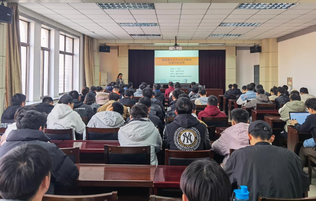 鄧雪介紹了超穩(wěn)激光以及光學(xué)頻率傳遞的基本原理以及當(dāng)前的發(fā)展趨勢(shì),詳細(xì)闡述其中的關(guān)鍵科學(xué)技術(shù)和難點(diǎn),并就超穩(wěn)激光器以及光學(xué)頻率傳遞系統(tǒng)的工程化進(jìn)行詳盡的講解。超穩(wěn)激光具有超高的頻率穩(wěn)定度以及超窄的線寬,使其廣泛應(yīng)用于前沿科學(xué)和工業(yè)領(lǐng)域,例如,引力波探測(cè)、相對(duì)論檢驗(yàn)、精密光譜、高精度光學(xué)原子鐘和光學(xué)頻率傳遞等。報(bào)告結(jié)束后,機(jī)電工程學(xué)院師生就超穩(wěn)激光器結(jié)構(gòu)設(shè)計(jì)與制作、工程難題解決方法等,與鄧雪進(jìn)行了深入交流。