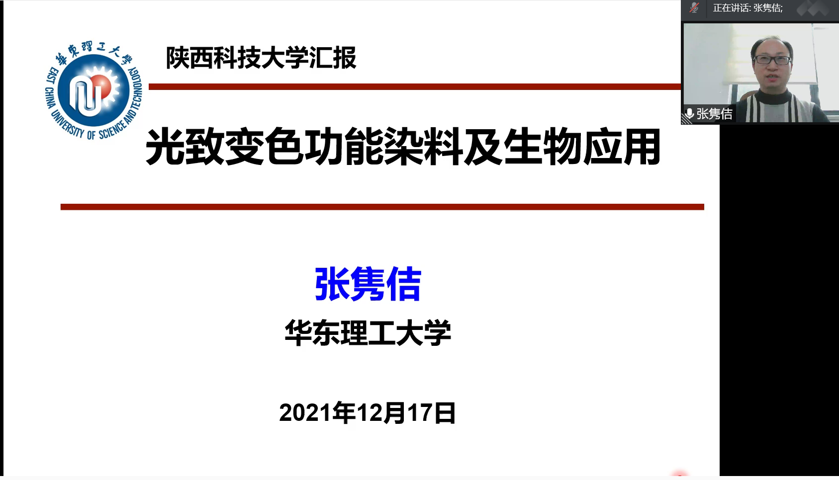 12月17日下午,應(yīng)我校輕工科學與工程學院、科技處及前沿院邀請,國家級人才稱號獲得者、華東理工大學張雋佶副教授做客我?!扒把乜茖W報告”,作了題為《光致變色功能染料及生物應(yīng)用研究》的報告。報告由輕工學院院長呂斌主持,輕工學院教師和研究生、本科生參加了此次報告。