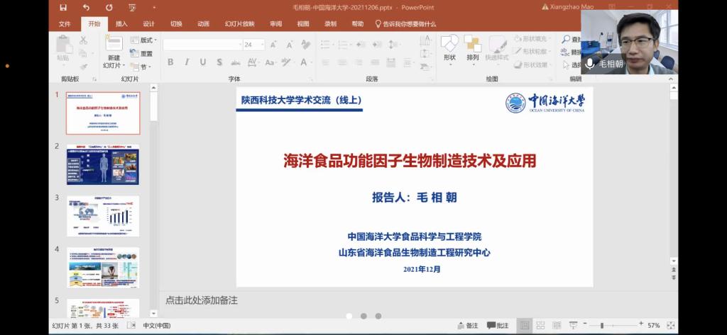 12月9日,中國海洋大學毛相朝教授應邀做客我校前沿科學報告,以“海洋功效因子的生物制造技術及應用”為題進行學術報告,因疫情影響,采取線下會場和線上騰訊會議兩種方式進行,報告會由食品與生物工程學院副院長李國梁教授主持,食品學院教師和研究生代表參加了本次報告會。