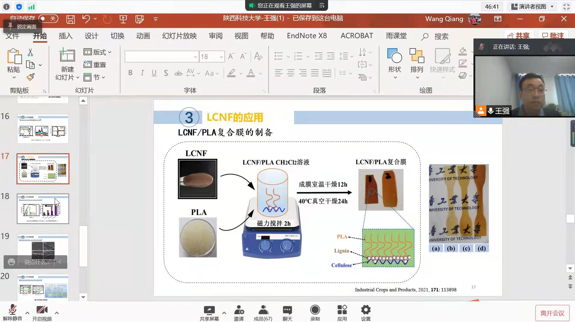 含木質(zhì)素納米纖維素作為一種綠色高分子材料,不僅具有天然纖維素的固有特性,同時(shí)也具有長寬比大、機(jī)械強(qiáng)度高、生物相容性好等優(yōu)良性能,其含有的木質(zhì)素顆粒具有改善纖維素疏水性和溶劑相容性的優(yōu)勢,因此其在復(fù)合材料領(lǐng)域具有潛在的應(yīng)用價(jià)值。報(bào)告中,王強(qiáng)教授以廢報(bào)紙為原料,分別采用硫酸水解法和超聲輔助球磨法制備含木質(zhì)素纖維素納米晶(LCNC)和納米纖絲(LCNF),闡述了LCNC添加量對復(fù)合水凝膠性能的影響,詮釋了木質(zhì)素含量對LCNF/PLA復(fù)合膜性能的影響規(guī)律。
