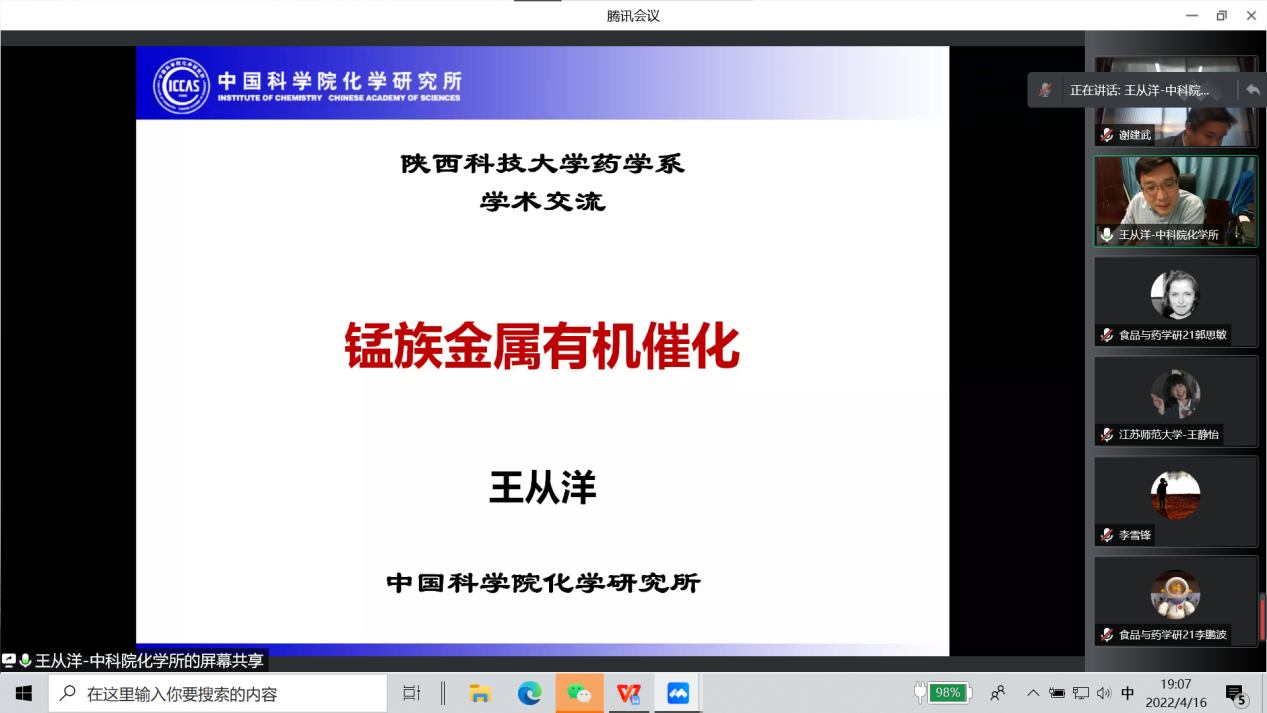 4月16日,應(yīng)食品與生物工程學(xué)院邀請(qǐng),中國(guó)科學(xué)院王從洋研究員、杜海峰研究員以及江蘇師范大學(xué)石楓教授做客我校前沿科學(xué)報(bào)告,分別作了題為“錳族金屬有機(jī)催化”“Asymmetric Catalysis with FLPs”“手性吲哚化學(xué)”的學(xué)術(shù)報(bào)告。食品學(xué)院部分教師和研究生參加了本次報(bào)告,報(bào)告會(huì)由食品學(xué)院副院長(zhǎng)李國(guó)梁(主持工作)主持。