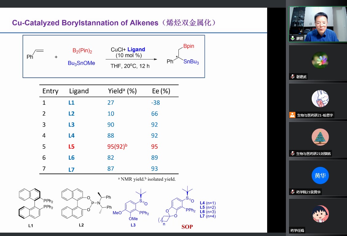 廖建研究員則基于手性的叔丁基亞磺酰胺設計了新型的膦配體,該配體催化性能非常好,主要體現(xiàn)在解決了不對稱合成上一些難以解決的反應,并且獲得了很好的收率及對映選擇性,特別是該類型催化劑在一些反應能夠通過微調,從而實現(xiàn)立體選擇性的翻轉。