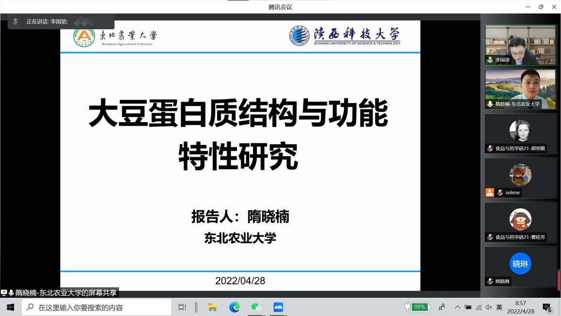 近日,應(yīng)食品與生物工程學(xué)院及??萍继幯?qǐng),東北農(nóng)業(yè)大學(xué)隋曉楠教授做客我校前沿科學(xué)報(bào)告,以“大豆蛋白質(zhì)結(jié)構(gòu)與功能特性研究”為題進(jìn)行學(xué)術(shù)報(bào)告,食品學(xué)院部分教師和全體研究生參加了本次報(bào)告會(huì),報(bào)告會(huì)由食品學(xué)院副院長(zhǎng)(主持工作)李國(guó)梁教授主持。