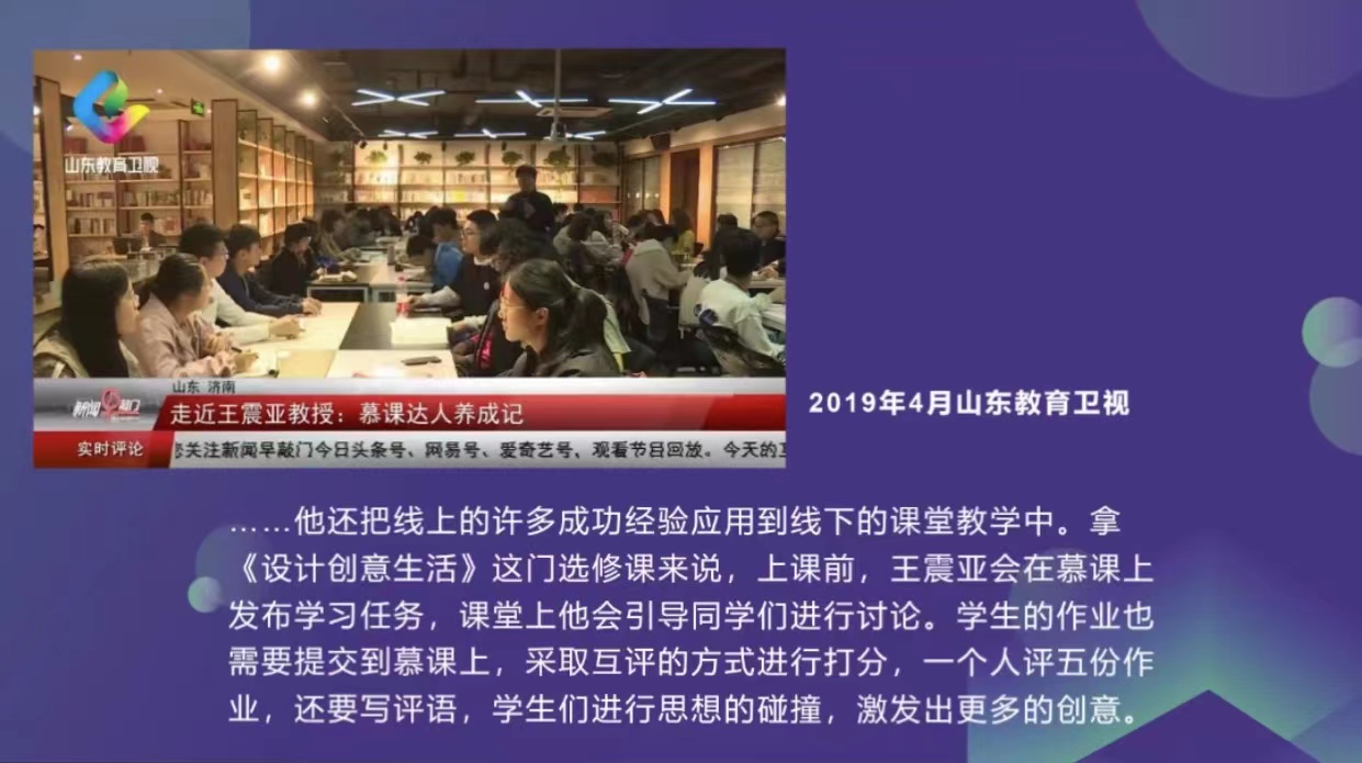王震亞,男,博士,教授,被評(píng)為山東大學(xué)首屆“我最喜愛的老師”,山東省教學(xué)名師。主持三門國家級(jí)一流課程,獲得國家級(jí)教學(xué)成果獎(jiǎng)1項(xiàng),省級(jí)教學(xué)成果獎(jiǎng)5項(xiàng)。2022年主持“線上線下混合式教學(xué)模式構(gòu)建與實(shí)踐”獲得山東省教學(xué)成果一等獎(jiǎng),主持教育部首批虛擬教研室試點(diǎn)項(xiàng)目一項(xiàng)。近年來致力于設(shè)計(jì)普及教育和在線設(shè)計(jì)教學(xué),主講《人人愛設(shè)計(jì)》、《設(shè)計(jì)創(chuàng)意生活》、《創(chuàng)客來了》、《設(shè)計(jì)史話》等4門慕課課程,在社會(huì)上引起了廣泛影響,選課人數(shù)超過50萬人。其中,《人人愛設(shè)計(jì)》是網(wǎng)絡(luò)上最受歡迎的設(shè)計(jì)類慕課之一,2017年有590所高校的78701名學(xué)生通過了課程學(xué)習(xí)獲得學(xué)分,被評(píng)為教育部首批國家級(jí)精品在線開放課程。2017年10月上線的《設(shè)計(jì)史話》打造了一個(gè)設(shè)計(jì)史教學(xué)研究的資源共享平臺(tái),吸引了30多所高校的師生積極參與。