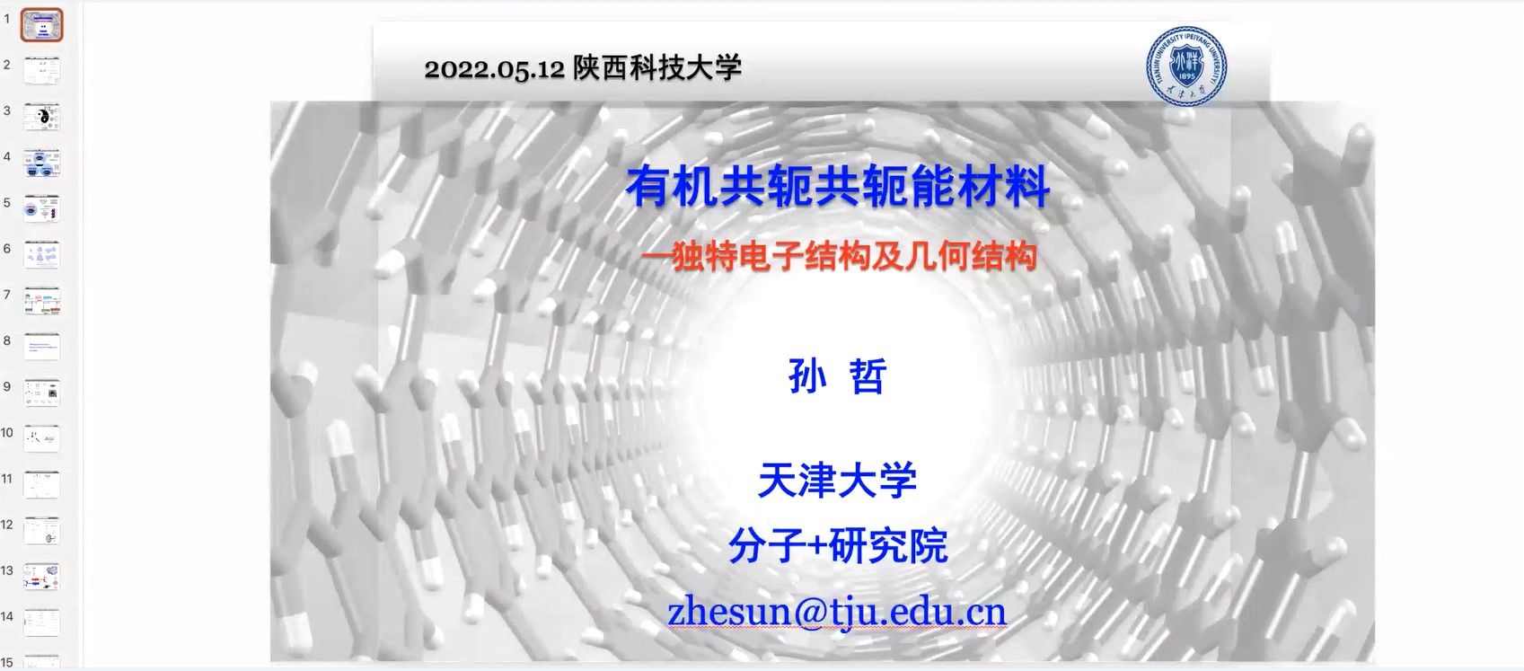 孫哲教授從傳統(tǒng)的有機(jī)共軛結(jié)構(gòu)與應(yīng)用分析出發(fā),介紹了共軛體系電子結(jié)構(gòu)和幾何結(jié)構(gòu)的相關(guān)性。先后介紹了課題組近年來圍繞雙線態(tài)單自由基、單線態(tài)雙自由基與碳納米環(huán)/帶/管/籠三個方面開展的系列工作,介紹了所合成有機(jī)共軛材料在響應(yīng)材料電荷、自旋傳輸有機(jī)導(dǎo)體、多孔材料超分子主客體手性材料等方面的獨(dú)特應(yīng)用。