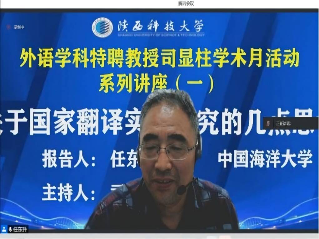 6月9日晚,中國海洋大學(xué)任東升教授應(yīng)邀做客我?!扒把貙W(xué)科報告”,作為我校文理學(xué)院外語學(xué)科特聘教授司顯柱學(xué)術(shù)月活動系列講座首位開講嘉賓,做了題為“關(guān)于國家翻譯實踐研究的幾點思考”的線上報告。報告由司顯柱教授主持,文理學(xué)院師生150余人聆聽了此次報告。文理學(xué)院6月組織開展的外語學(xué)科特聘教授司顯柱學(xué)術(shù)活動系列講座,旨在充分發(fā)揮我校特聘教授學(xué)術(shù)引領(lǐng)和資源共享作用,推動我校外語學(xué)科內(nèi)涵發(fā)展。