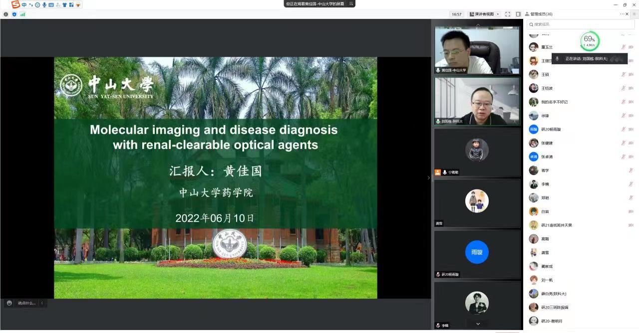 6月10日,應(yīng)我校輕工科學(xué)與工程學(xué)院、科技處、前沿院、研究生院邀請(qǐng),中山大學(xué)教授黃佳國、蘭州大學(xué)教授孫春霖分別做客我校“前沿科學(xué)報(bào)告”“未央導(dǎo)師論壇”,分別作了題為“Molecular imaging and disease diagnosis with renal-clearable optical agents”“有機(jī)手性激光材料的設(shè)計(jì)與表征”的線上學(xué)術(shù)報(bào)告。報(bào)告由輕工學(xué)院副院長劉國棟主持,學(xué)院相關(guān)專業(yè)教師、研究生參加了此次報(bào)告會(huì)。