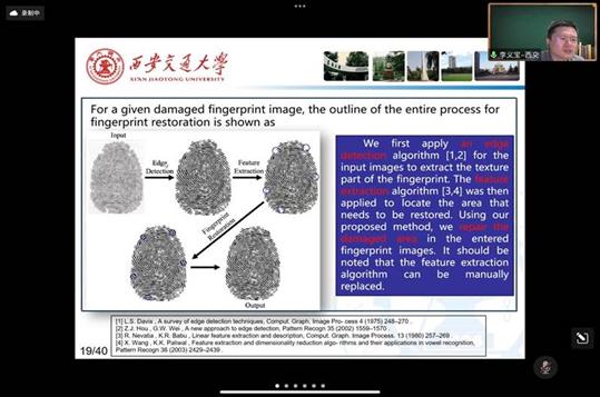 報告會上,李義寶教授結合實踐經驗和研究成果,介紹一個非局部的Cahn-Hilliard方程及其在3D打印和指紋修復中的應用。報告首先介紹了引入非局部Cahn-Hilliard方程目的是模擬高分子聚合物的微觀相分離。通過多次數值試驗得到高效、節(jié)省容量的時間和步長。其次提出利用Crank-Nicolson方法離散非局部Cahn-Hilliard方程,并證明該方案是無條件能量穩(wěn)定。然后提出一種穩(wěn)健高效的指紋圖像恢復算法和3D打印表面圖案生成方法?;谙噜徬袼匦畔⒌闹讣y恢復技術既能保證指紋信息的準確性,又節(jié)約計算成本。最后通過數值算驗證了所提方法的有效性。