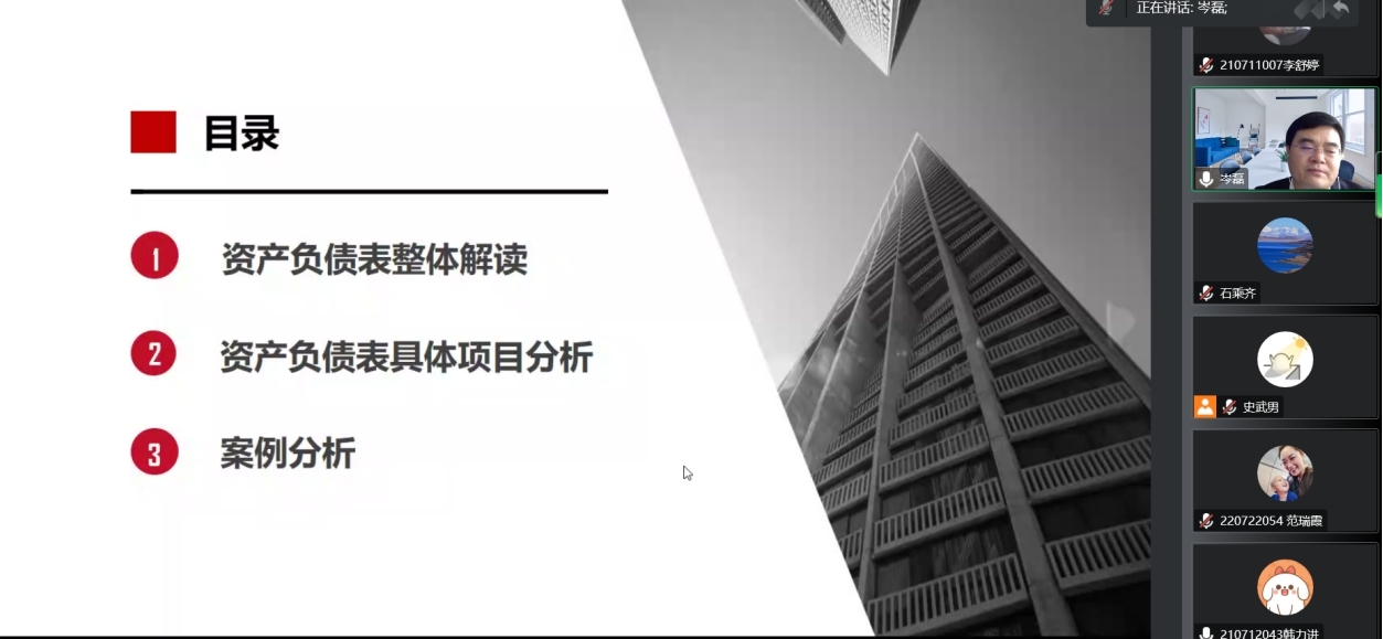 講座從資產(chǎn)負(fù)債表整體解讀、資產(chǎn)負(fù)債表具體項(xiàng)目分析、案例分析等三個(gè)方面展開(kāi)。在歷時(shí)兩個(gè)小時(shí)的講座中,岑磊博士結(jié)合理論研究、案例分析、實(shí)操實(shí)踐等,講解了如何通過(guò)資產(chǎn)負(fù)債表分析企業(yè)的風(fēng)險(xiǎn),如何從股權(quán)、債權(quán)等多元角度剖析企業(yè)資產(chǎn)負(fù)債結(jié)構(gòu),如何從存貸雙高、高額利息凈支出以及其他異常因素等方面識(shí)別貨幣資金異常等。