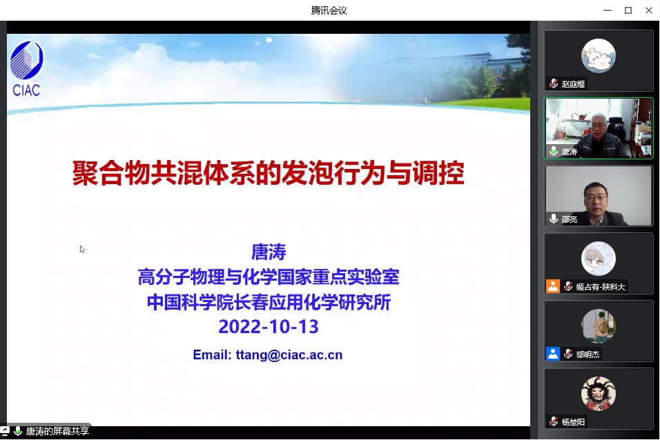 10月13日,受我??萍继?、化學(xué)與化工學(xué)院邀請(qǐng),中國(guó)科學(xué)院長(zhǎng)春應(yīng)用化學(xué)研究所唐濤研究院做客我?!扒把乜茖W(xué)報(bào)告”,為我校師生帶來(lái)題目為“聚合物共混體系的發(fā)泡行為與調(diào)控”的線上報(bào)告。報(bào)告由教務(wù)處副處長(zhǎng)、化工學(xué)院邵亮教授主持,相關(guān)專業(yè)教師、研究生參加了此次報(bào)告。