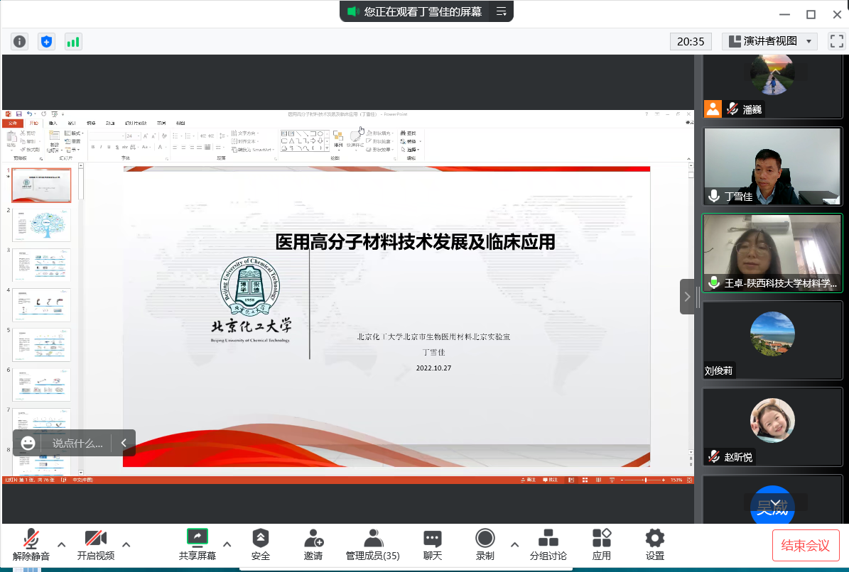 10月27日,受我??萍继?、材料科學(xué)與工程學(xué)院(文物保護(hù)科學(xué)與技術(shù)學(xué)院)邀請(qǐng),北京化工大學(xué)丁雪佳教授做客我?!扒把乜茖W(xué)報(bào)告”,為我校師生帶來(lái)題目為“醫(yī)用高分子材料技術(shù)發(fā)展及臨床應(yīng)用”的線上報(bào)告。報(bào)告由材料學(xué)院副院長(zhǎng)王卓教授主持,相關(guān)教師和研究生參加了此次報(bào)告。