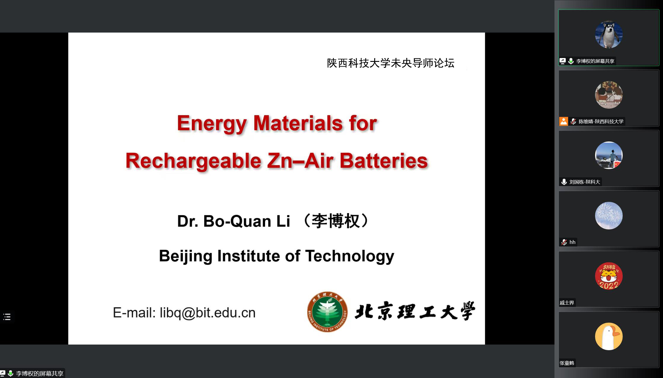 11月17日,應(yīng)我校柔性電子學(xué)院和研究生院邀請,北京理工大學(xué)李博權(quán)副研究員做客我?!拔囱雽?dǎo)師論壇”,作了題為“二次鋅空氣電池的多相界面設(shè)計與調(diào)控”的線上學(xué)術(shù)報告。報告會由柔性電子學(xué)院副院長劉國棟主持,相關(guān)專業(yè)教師和研究生參加了此次報告會。