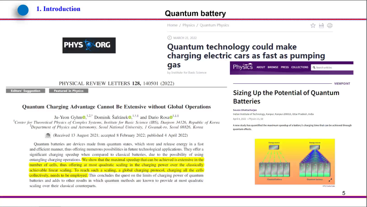 本報(bào)告在介紹量子電池基本概念、研究背景以及研究現(xiàn)狀的基礎(chǔ)上,重點(diǎn)介紹報(bào)告人所在課題組最近在該領(lǐng)域的幾個(gè)研究工作:1)擴(kuò)展Dicke量子電池,構(gòu)建了具有原子間相互作用與外場(chǎng)驅(qū)動(dòng)的腔量子電池——擴(kuò)展Dicke量子電池模型,分析了電池性能,發(fā)現(xiàn)最大存儲(chǔ)能量有一個(gè)臨界行為,獲得了對(duì)應(yīng)的臨界相互作用,進(jìn)一步分析了該電池的量子優(yōu)勢(shì),獲得了最大存儲(chǔ)能量、能量量子漲落以及最大平均功率與原子數(shù)之間的關(guān)系,發(fā)現(xiàn)最大充電功率的量子優(yōu)勢(shì)滿(mǎn)足一個(gè)超線(xiàn)性關(guān)系,通過(guò)調(diào)控腔與原子間耦合、原子間相互作用以及驅(qū)動(dòng)場(chǎng)強(qiáng)度等可實(shí)現(xiàn)高效的充電過(guò)程;2)腔Heisenberg-自旋鏈量子電池,提出了腔Heisenberg-自旋鏈量子電池模型,相比于自旋鏈量子電池,其性能明顯提升,最大充電功率的量子優(yōu)勢(shì)中標(biāo)度指數(shù)能達(dá)到2,借助Wigner函數(shù)、von Neumann熵以及負(fù)值度等分析了量子糾纏在該量子電池中的作用。