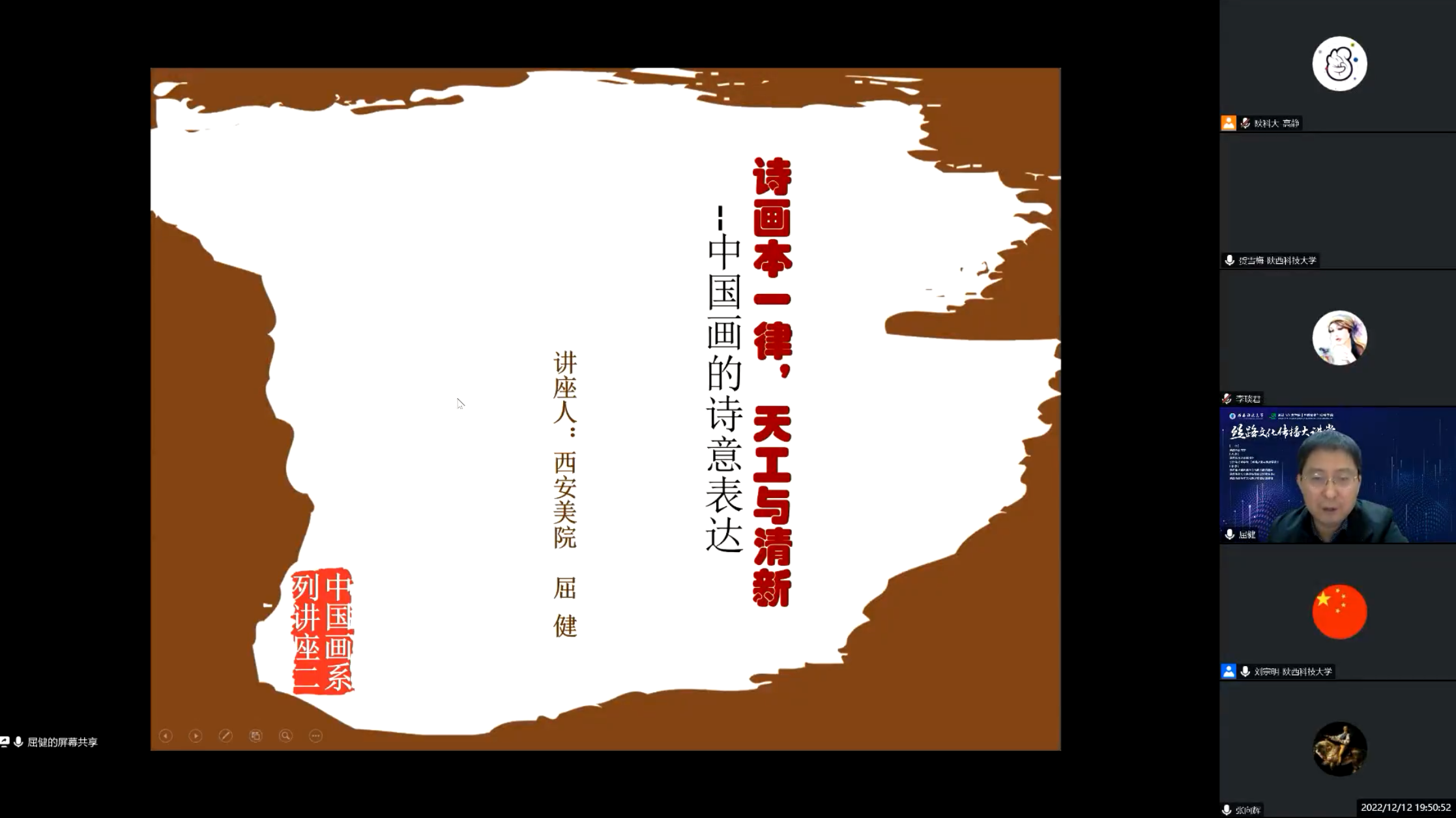 12月12日晚,應(yīng)我校設(shè)計與藝術(shù)學(xué)院、科技處及前沿院邀請,西安美術(shù)學(xué)院副院長屈健教授做客我校“前沿科學(xué)報告”,作了題為“詩畫本一律 天工與清新—中國畫的詩意表達(dá)”的學(xué)術(shù)報告。報告會由設(shè)藝學(xué)院院長劉宗明教授主持,設(shè)藝學(xué)院相關(guān)專業(yè)師生及全國藝術(shù)設(shè)計同行近300人參加此次報告會。