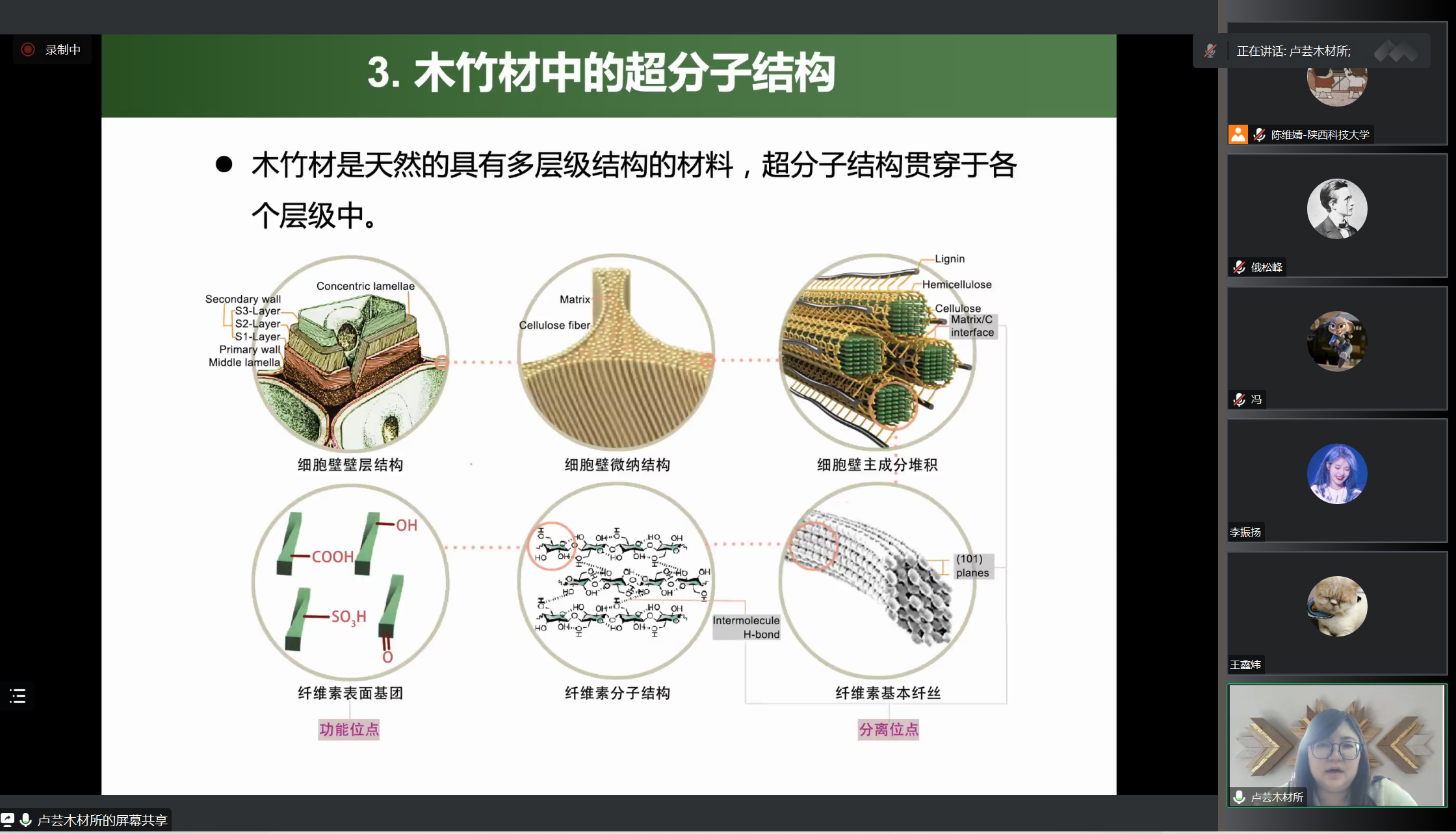 盧蕓研究員主要介紹了木竹材的儲(chǔ)碳背景以及木竹材超分子科學(xué)的定義與發(fā)展。從木竹材超分子結(jié)構(gòu)解譯、分子間相互作用、超分子功能體系構(gòu)筑、超分子聚集效應(yīng)等方面詳細(xì)講解了木竹材超分子科學(xué)的研究進(jìn)展。重點(diǎn)闡述了木材細(xì)胞壁S2層聚集體薄層的分離及在鋰電池方面的應(yīng)用,基于射線組織調(diào)控的木基骨架彈性材料制備以及基于竹材導(dǎo)管調(diào)控的竹材催化毛細(xì)微反應(yīng)器構(gòu)筑。