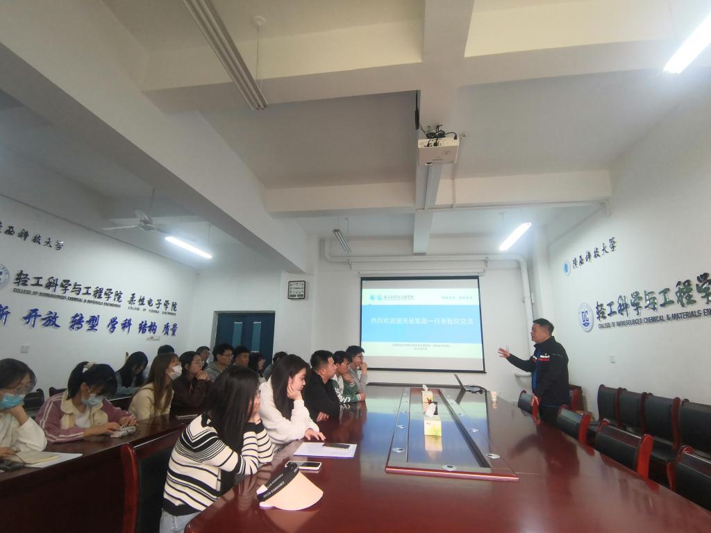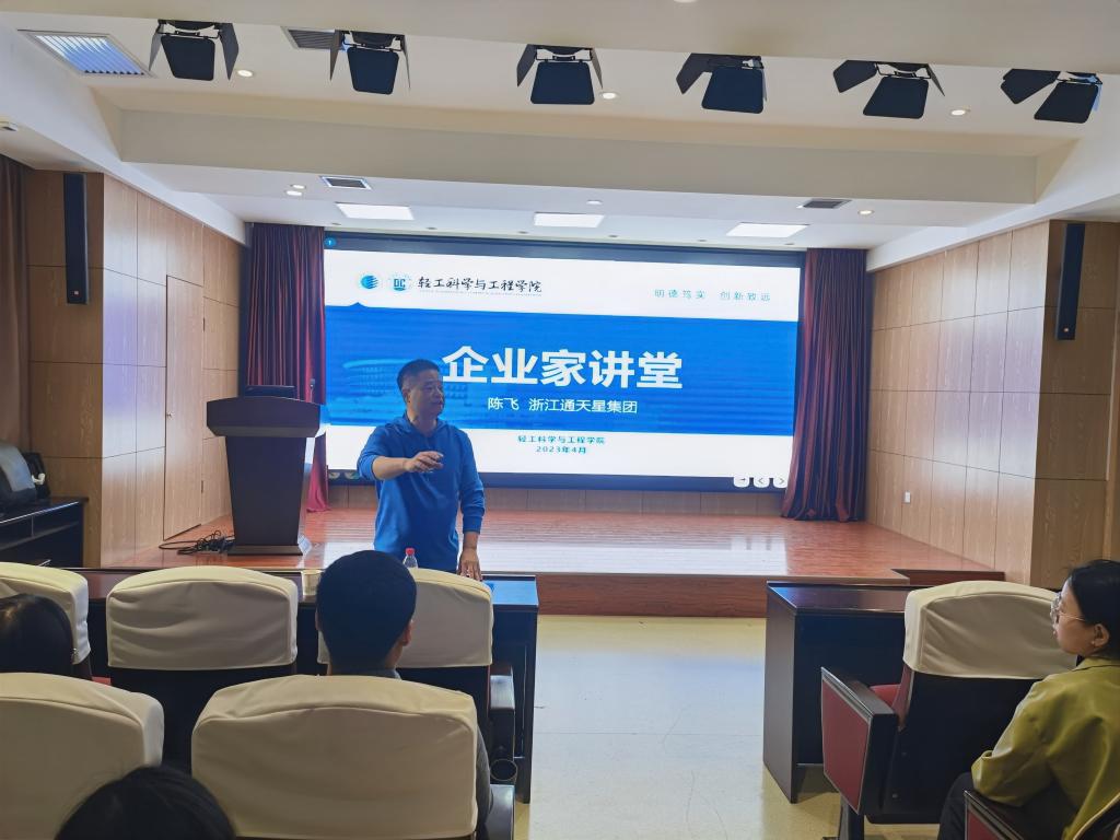 4月11日,應(yīng)輕工科學(xué)與工程學(xué)院(柔性電子學(xué)院)邀請,浙江通天星集團股份有限公司陳飛董事長做客我?!拔囱雽?dǎo)師論壇”,作了題為“皮革前沿科技的發(fā)展與人才需求”的專題報告。報告會由輕工學(xué)院黨委副書記張乾隆主持,學(xué)院輕化工程部分師生參加了此次報告會。