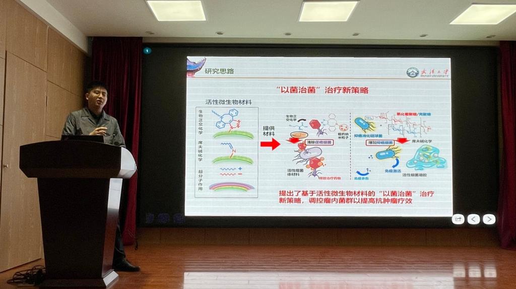 鄭迪威副研究員結(jié)合自己的科研工作,從活性微生物材料的構(gòu)建,“以菌治菌”治療新策略,“以菌代菌”治療新概念等方面詳細(xì)講解了活性微生物材料治療疾病的相關(guān)研究。微生物在人體健康中發(fā)揮著重要的作用,他重點(diǎn)講解了以菌群為靶點(diǎn)治療重大疾病,基于主客體作用、疏水作用力、兩親性分子自組裝構(gòu)建了融合高分子材料與微生物彼此優(yōu)勢(shì)的活性微生物材料。這些微生物材料可以通過(guò)精準(zhǔn)調(diào)控口腔菌群,上調(diào)抗癌菌,下調(diào)促癌菌等方法治療多種人體代謝性疾病。