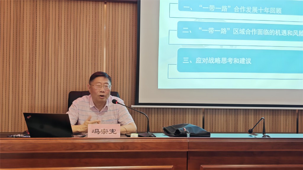 報告會上,馮宗憲教授首先回顧了我國與“一帶一路”國家的經貿歷史,介紹了我國提出“一帶一路”倡議的歷史背景和政策內涵及十年來在“政策溝通、設施聯(lián)通、貿易暢通、資金融通、民心相通”方面取得的成就。隨后對當前國際國內形勢變化的趨勢、特征和挑戰(zhàn)進行了梳理,在此基礎上提出未來我國應持續(xù)推進自由貿易區(qū)戰(zhàn)略,與沿線國家共建高質量、可持續(xù)、惠民生的“一帶一路”國際合作新模式。