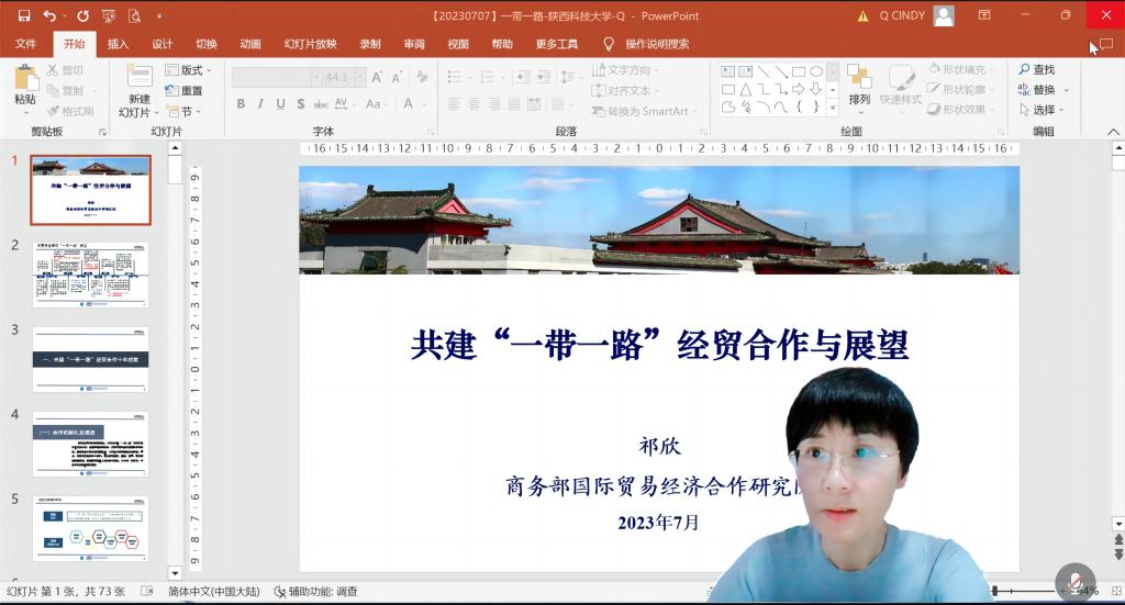祁欣研究員首先介紹了“一帶一路”倡議提出以來(lái),我國(guó)與沿線國(guó)家經(jīng)貿(mào)合作的發(fā)展進(jìn)程,并用豐富的案例展現(xiàn)了我國(guó)與沿線國(guó)家在“政策溝通、設(shè)施聯(lián)通、貿(mào)易暢通、資金融通、民心相通”方面取得的成就。隨后從世界經(jīng)濟(jì)困境、大國(guó)博弈、地緣政治沖突、后疫情重建等方面分析了“一帶一路”經(jīng)貿(mào)合作面臨的挑戰(zhàn),提出未來(lái)可以通過(guò)加強(qiáng)更多國(guó)家合作、拓展更廣合作領(lǐng)域、促進(jìn)更高水平合作、推動(dòng)更深層次合作、發(fā)展新業(yè)態(tài)新模式、構(gòu)建更緊密合作紐帶、統(tǒng)籌發(fā)展與安全來(lái)持續(xù)推進(jìn)“一帶一路”經(jīng)貿(mào)合作。