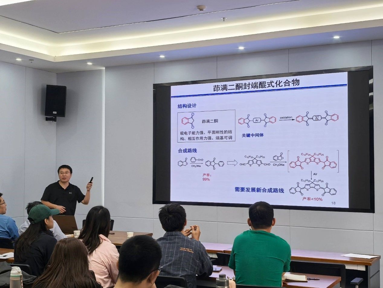 醌式結(jié)構(gòu)共軛小分子具有帶隙窄、平面性好和剛性強(qiáng)的特點(diǎn),在末端引入腈基(CN)、酯基(COOR)等吸電子基團(tuán)后可使化合物具有極低的HOMO和LUMO能級,是目前重要的n型小分子半導(dǎo)體材料品種,然而目前文獻(xiàn)報(bào)道的醌式結(jié)構(gòu)末端含有強(qiáng)吸電子的單元,例如雙氰基,難以引入聚合官能團(tuán)。在報(bào)告中鄧云峰教授詳細(xì)介紹了1,3-茚滿二酮為端基新型醌式共軛體系的高效合成方法及其在構(gòu)筑n型有機(jī)/聚合物半導(dǎo)體材料中的應(yīng)用。與會(huì)師生熱情的與陸雪峰教授進(jìn)行了交流探討,本次學(xué)術(shù)交流活動(dòng)圓滿成功。