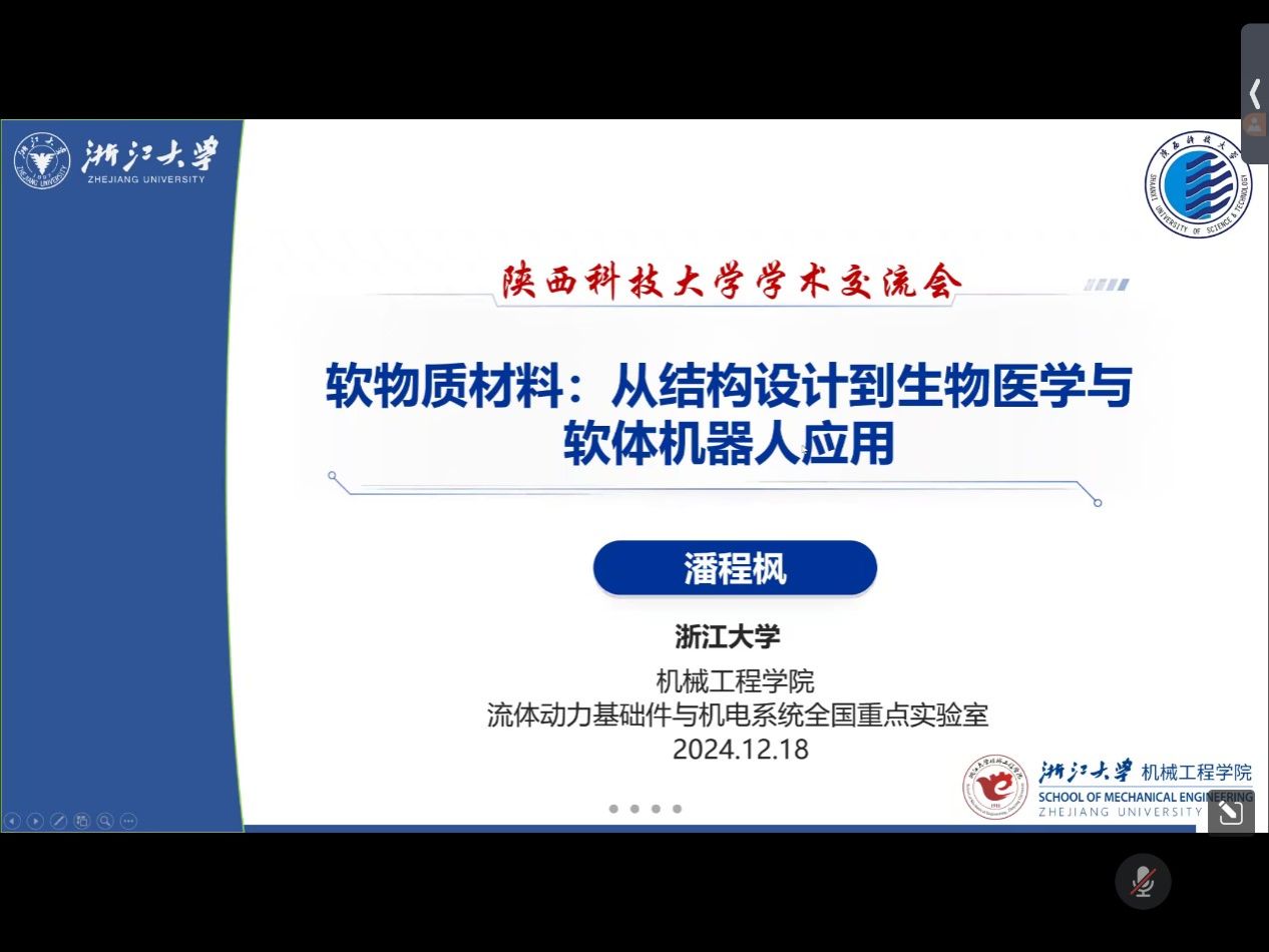 12月18日下午,應(yīng)輕工科學(xué)與工程學(xué)院(柔性電子學(xué)院)、科技處和前沿院邀請,浙江大學(xué)潘程楓研究員做客我?!扒把乜茖W(xué)報告”,作了題為 “軟物質(zhì)材料:從結(jié)構(gòu)設(shè)計到生物醫(yī)學(xué)與軟體機器人應(yīng)用”的線上學(xué)術(shù)報告。輕工學(xué)院相關(guān)師生參加了本次報告會。